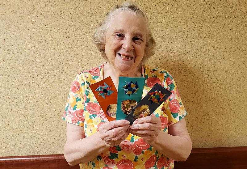 Bev has always had a passion for the arts and as a former recreational therapy student, scout leader, substitute teacher, and mother she knows the relaxation that comes from art. Beverly, now a resident at the Westport Place Health Campus, says she doesn't want to spend her time playing bingo or cards; she'd rather use her artistic talents to find ways to inspire and bring a little bit of beauty to others. Each bookmark she makes takes approximately 3 hours as she cuts the cardstock, makes unique origami decorations, adds pressed flowers (sometimes petal-by-petal), and adds an inspirational quote to the back - resulting in one of a kind spot-savers for avid and beginning readers alike. Her bookmarks have traveled the world through friends and family who have delivered them to non-profits in Asia, Africa, and South America, and Bev donates them locally to prisons, veterans groups, after school programs, and children's hospitals.